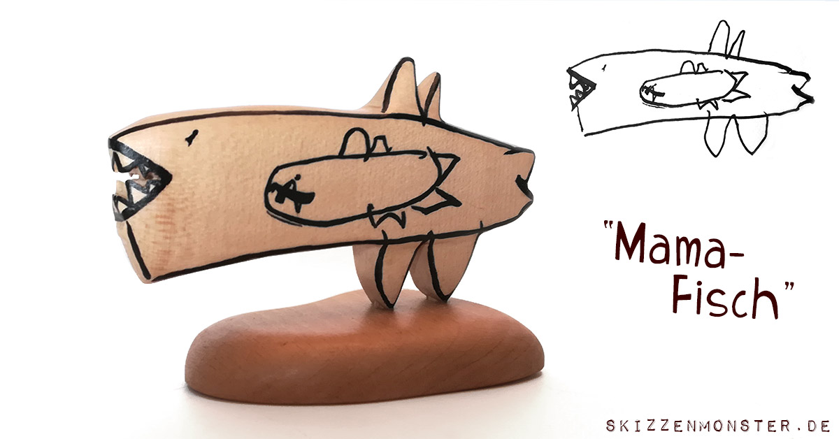 Mal wieder ein für mich besonders spannendes Skizzenmonster. Ich liebe es einfach, wenn Kinder all die Gefühle aus dem Bauch heraus in solch eine Zeichnung stecken. Auch wenn sie etwas gruseliges hat – vielleicht ist Mama ja manchmal auch etwas bissig? 😀 – so steht für mich hier die Geborgenheit vom kleinen Fischlein im Bauch im Vordergrund.