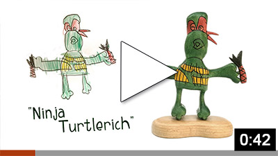 Übrigens: Falls Du selbst eine schicke Kinderzeichnung hast, die darauf wartet, umgesetzt zu werden… ein paar Infos und FAQ über die Entstehung eines Skizzenmonsters findest Du hier!